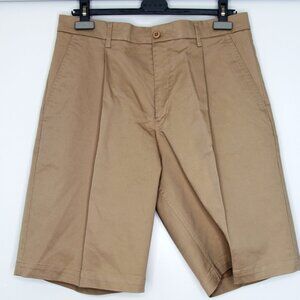 Wide leg shorts with dropped crotch and front pleats. Slanted front pockets, back jet pockets. Belt loops, zipped fly. Cotton and polyester blend fabric with added stretch.