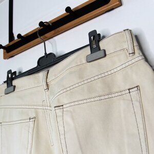 Trucker Cut Offs in beige by Rick Owens DRKSHDW. A mid-rise five pocket cut off short with contrast stitching, front button, zip fastening, and a DRKSHDW hanging ribbon.