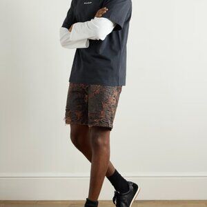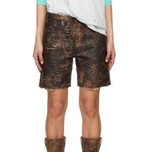 The Fn-Mn-Shor000260 Shorts in Brown by Acne Studios offer a modern take on casual wear. Crafted from cotton with a cow leather patch, the loose-fit silhouette sits at a low waist with a dropped crotch for a relaxed vibe. Falling below the knee, the design features distressed denim jacquard adorned with the Acne Studios monogram motif, adding a subtle yet bold touch.