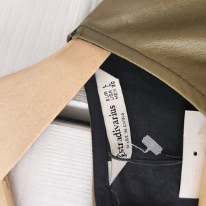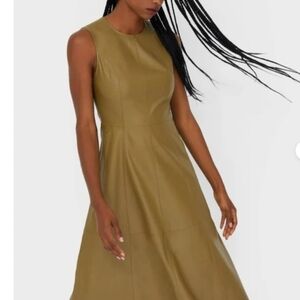 Bold faux leather midi dress in olive green. Sleeveless A-line fit with a sleek flare — perfect for layering, street chic vibes, or standout night looks. NWT, Size L.