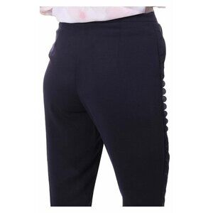 Chic tapered trousers from Ted Baker, constructed of Navy Blue crepe and accented with eye-catching scallop trim down the leg, around the pockets, and at the hem. Designed with on-trend tapered-leg styling and also featuring flat front with silvertone TB logo plaque, pockets at the hip, and a hidden side zip. Ted Baker style 'DYANNI'.