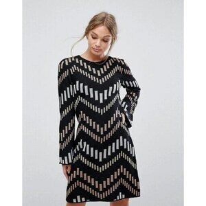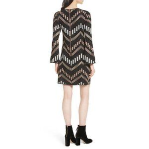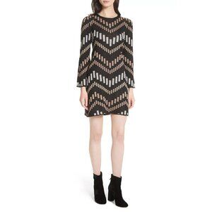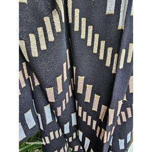 The TED BAKER Black Rose Gold Silver Metallic Bell Sleeve Rozzy Knit Dress is a chic, curve-skimming sweater dress, perfect for holiday festivities. It features a shimmering mixed-metal design, elegant bell sleeves, and a back zipper in the brand's signature rose-gold color. The dress has a crew neck, long sleeves, and is unlined. Made from 46% viscose, 43% polyamide, and 11% metallic fibers, it is machine washable and imported. Brand new, this dress combines elegance and sparkle for a standout look.