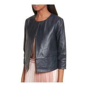 The essential leather jacket is made more refined and ladylike in this buttery-soft, collarless style with an asymmetrical front and three-quarter-length sleeves