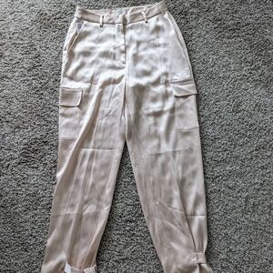 New with tags satin nude cargo pants from Wilfred. They have a clasp closure, cargo pockets on either side, pockets and fitted ankles.