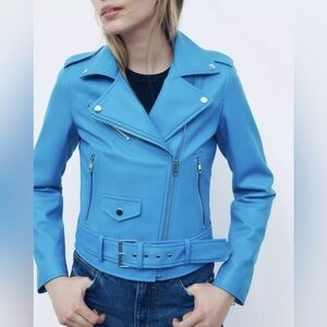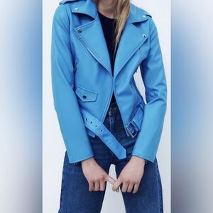 BNWT Zara Faux Leather Blue Moto Jacket - Size Small