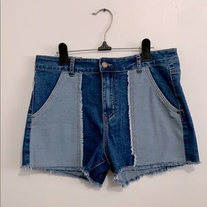- Stylish two-tone denim shorts perfect for casual outings. Features a unique design with a blend of dark and light blue shades. Comfortable and trendy for everyday wear.