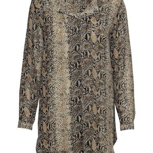 Brown, black and cream tones. Button cuffs. V-neck style with buttons all down the front.