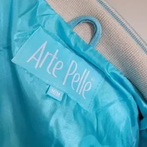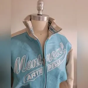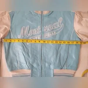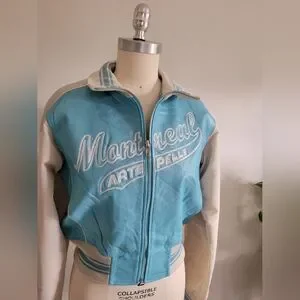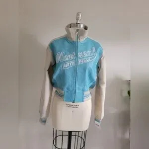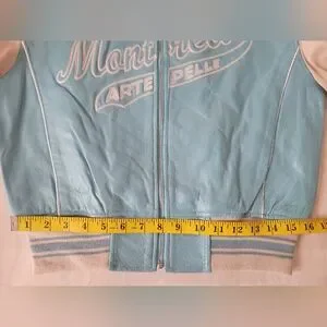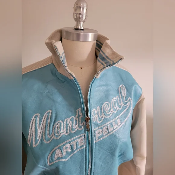 Brand new Arte Pelle brand jacket. Montreal embroidered on front. Leather body with fabric sleeves. Striped ribbing on collar, cuffs and waistband give it a vintage feel.