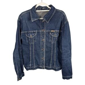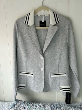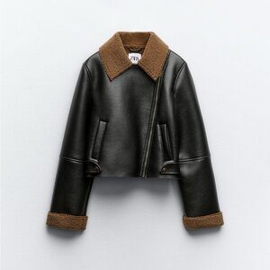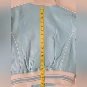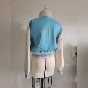 BNWT leather "Montreal" cropped bomber jacket in blue and cream vintage style