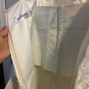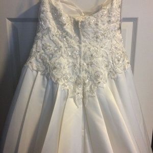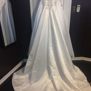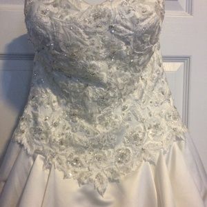 This dress is a beautiful strapless satin and pearl organza ball gown wedding dress with a sweetheart neckline! This dress has a fitted beaded bodice (built in adjustable corset) and a full skirt with semi-cathedral train.