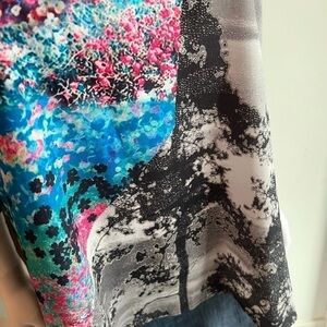 No material tag - guessing polyester front and a cotton blend sleeves and back.