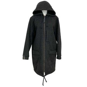 BODYBAG BY JUDE CHARCOAL GREY WOOL BLEND HOODED MID-LENGTH COAT, this is a neutral mature trendy minimalist charcoal grey hooded parka in a wool blend fabric in a soft shell yet structured mid-length style with long sleeves half ribbed horizontaly - leather zipper hanger - front zip full length.- hoodie - super soft cozy fleece inside - drawstring at the bottom hemlie to cut the wind off - flat pockets with a welt vertically oriented pockets on the front, all usable. Perfect late fall early winter mild weather coat.