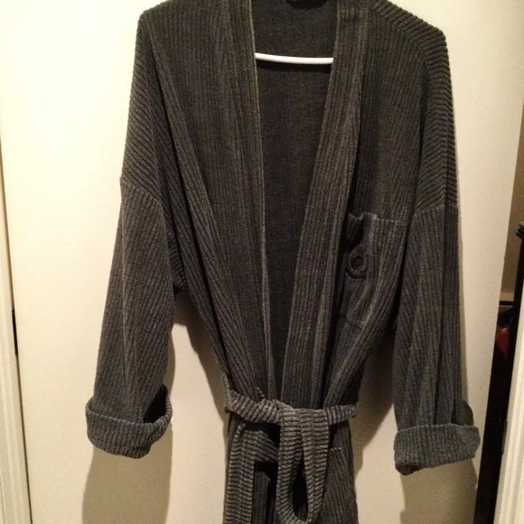 Cozy gray robe with a matching belt. Features 2 pockets for convenience..