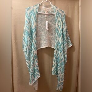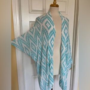 Embrace a blend of comfort and style with this chic, lightweight wrap. The piece features a captivating geometric pattern in soothing shades of blue and white, exuding a tranquil, yet fashionable vibe. Its flowing design offers versatility, allowing it to be draped elegantly over the shoulders or wrapped snugly for a cozier feel. An ideal accessory for layering, this wrap brings a touch of elegance to any casual or sophisticated ensemble. NWT size S/M