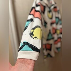 Vibrant shirt with geometric patterns in red, yellow, and teal. Perfect for a bold look. No size tags so be mindful with with measurements I have provided. I would place it as a Men’s medium.