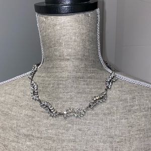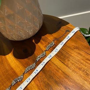 Rhinestone necklace in a fern leaf shaped pattern. Pair it with a simple sweater and pair of jeans, or wear it with a preppy dress! Necklace measures about 20 inches long. Excellent used condition. Only 1 stone missing on entire necklace, but very hard to tell as the base is grey (shown in pictures). Has “M” embossed on the clasp area, but do not recall where it was purchased.