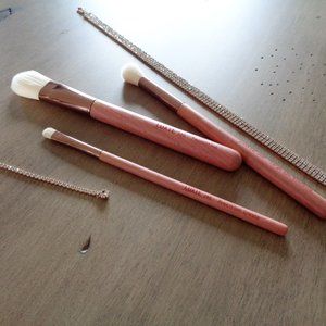 Set of 3 pieces of make-up brushes. 510 is a foundation brush. It works well whether with cream or liquid foundation and gives you a polished look with none of the streakiness that ordinary brushes might give you. The next brush is 246, a precision crease brush. It has a tapered end that gives a concentrated color on your creases. Lastly, there’s 250, a large blending brush. It makes eyeshadow application absolute breeze. All three brushes have natural wood pink handles with rose gold accents.