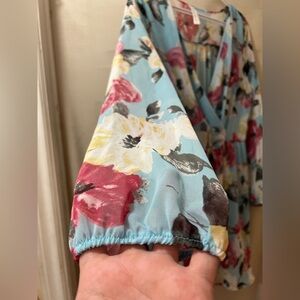 Beautiful light blue floral wrap style dress. Long sleeves, V-neck. Lightweight material, perfect for spring or summer. Size Large.