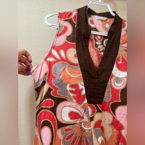 This sleeveless dress features a vibrant mix of colors and bold patterns. Perfect for a stylish and unique look. There is no size tag on it but should fit like a medium. I have added the measurements to avoid any confusion.