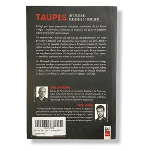 Rédigé par deux journalistes d'enquête chevronnés de La presse, Taupes - Infiltrations, Mensonges et Trahisons est un récit palpitant, digne d'un thriller d'espionnage. Les taupes sont la hantise des services de renseignement et des corps policiers. Certaines sont parachutées pour infiltrer un pays, dérober des secrets et recruter d'autres taupes. D'autres trahissent l'organisation qui les emploie et offrent leurs services à «l'ennemi» par vengeance, pour flatter leur ego ou par appât du gain. Leurs aventures rocambolesques fascinent ou choquent et les ravages qu'elles causent avant d'être détectées leur valent ce surnom bien mérité ! De Montréal à Moscou, ces enquêtes captivantes apportent un éclairage nouveau sur des cas marquants de l'actualité canadienne, entre autres ceux de Benoît Roberge, enquêteur-vedette sur le crime organisé, Jeffrey Delisle, officier reconnu coupable d'espionnage, et Donald Heathfield et Tracey Ann Foley, le célèbre couple d'«illégaux» du KGB.