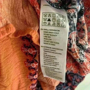 Lovely blues and burnt orange and red accents, throw on some sandals and a wide brim hat and you are ready for summer! 100% rayon, super soft with flowy wrinkled texture Flattering cut outs to back with a single button closure Size S In great condition, back button could use a stitch to secure tighter Dog friendly, smoke free home