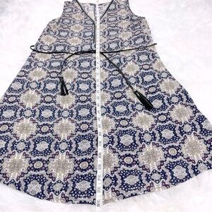 Light and airy dress by Suzy Shier. The waist ties up with a braided faux leather mini belt with beads and tassels at the ends. The print on the dress is a blue and beige floral/mandala effect, and there is a front zipper detail that allows you to control the depth of the v-neckline. Size small.