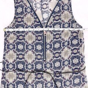 Light and airy dress by Suzy Shier. The waist ties up with a braided faux leather mini belt with beads and tassels at the ends. The print on the dress is a blue and beige floral/mandala effect, and there is a front zipper detail that allows you to control the depth of the v-neckline. Size small.