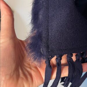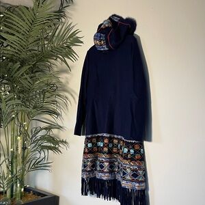 BOHO Navy Hooded Coat – Multi-Color Embroidery & Rabbit Fur Trim & Fringe Hem