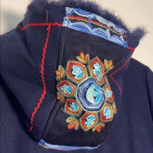 This one-of-a-kind longline coat features a deep, midnight navy body with real blue rabbit fur trim that serves as the perfect canvas for its vibrant personality. The real magic is in the details: a bold crimson-lined hood that frames the face beautifully and intricate, high-density embroidery that wraps around the hem and shoulders in a stunning display of floral and geometric motifs.
