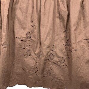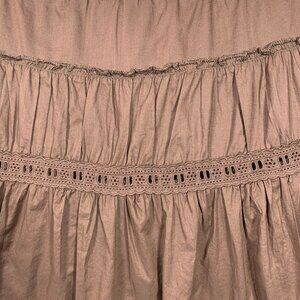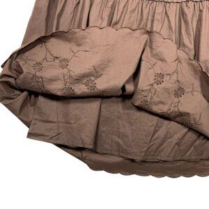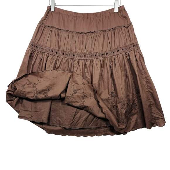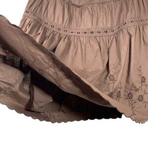 brown, tiered Nevada brand skirt. floral embroidery near the hem and a crochet-style trim detail above the second tier
