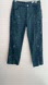 Bolaijue green jeans are 5 pocket straight leg ankle length. Button and fly closure. Front seams down both legs. There is silver embroidery on the front of the legs that looks like abstract lines and flowers. The button has a rhinestone in it. 95% cotton/5% spandex blend.