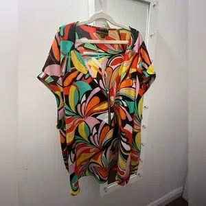 Vibrant abstract print top by BOLD elements. Short sleeves with a relaxed fit. V-neck with front zip detail. Bold, colorful pattern for statement wear.
