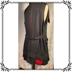 Absolutely lovely long black vest from Boo Radley. Black felt wool w/ red flower design, 50% wool & 50% poly, fully lined, a variety of textures to delight your visual senses. Two exterior snap pockets, and extra large felted button incl. So many great details to this vest - see pics!