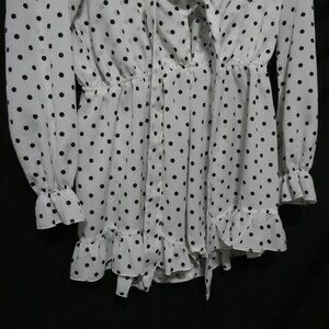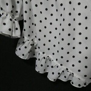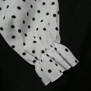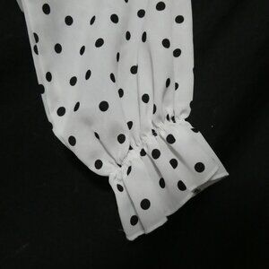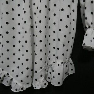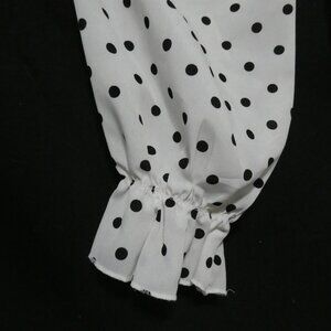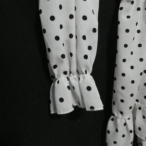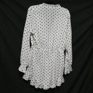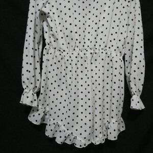 White long sleeved romper with black polka dots and ruffle details at the collar, cuffs, and hem