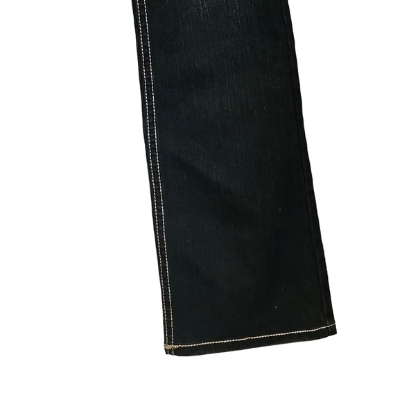 Style tags: denim, jeans, bootlegger, dark wash, mid rise, detail stitching, contrast stitching, y2k, bratz, 2000s, street style, traditional, classic, staple, NWT