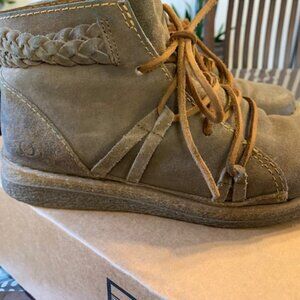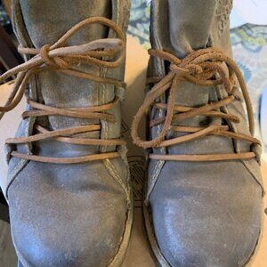 Good used condition BORN BOOTIES distressed suede leather upper. Taupe colour, size 7-1/2 M These booties still have lots of life left in them. They were sprayed with protector.