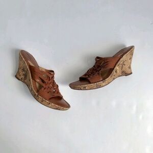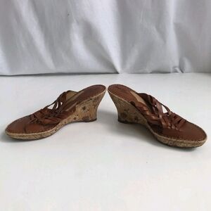BORN 'DRILLES Women Tan Woven Leather Straw Floral Wedge Slide Sandals 8/39