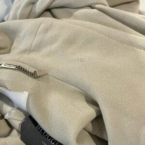 The Kallmi trench vest from BOSS Hugo Boss is made in a beige stretch knit, and features a sleeveless design, a draped collar, a waist tie, side seam pockets, and tonal stitching.