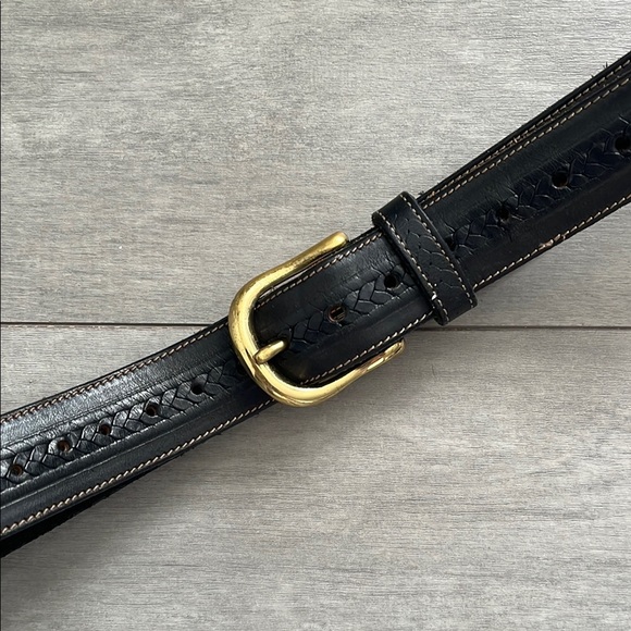 This exquisite belt showcases a rich brown leather with a textured finish, complemented by a gold-colored buckle for a timeless appeal. The decorative stitching along the edges adds a touch of sophistication, making it a versatile accessory for any wardrobe. Perfect for both formal and casual occasions, this belt is a stylish addition to any outfit. Men’s or women’s style. Excellent condition. Leather