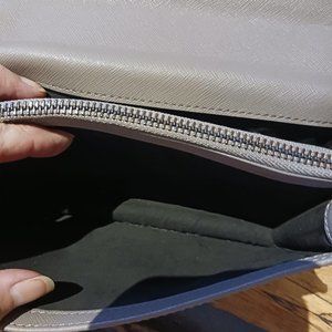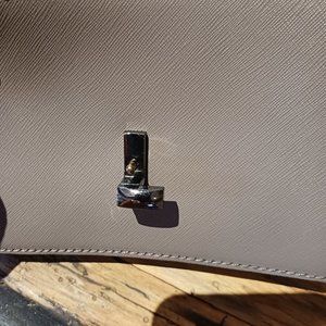 Saffiano Leather and gray suede with gun metal top hardware - handle has light scratching on one side, minor rubs in other places - very hard to see when wearing and only really when closely inspecting. Overall a sharp looking bag whose handle makes it easy to prop up onto a counter, desk, etc.