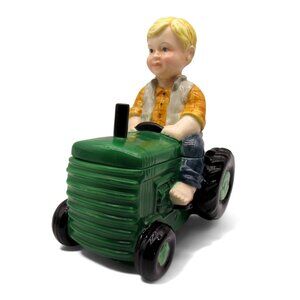 This charming ceramic cookie jar features a detailed boy figurine riding a green tractor, exuding a rustic farmhouse aesthetic.