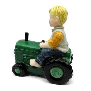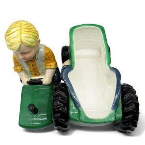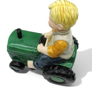 BOY Figurine On Green TRACTOR Ceramic Cookie Jar 11" Farmhouse Decor Rare Vintag