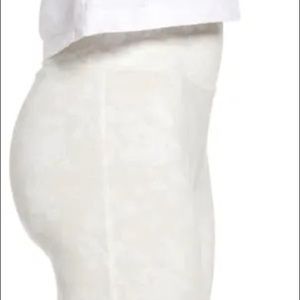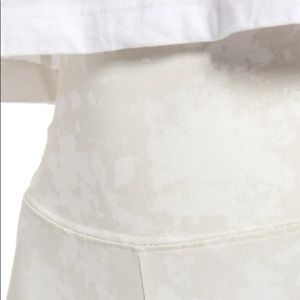 High waisted shorts are 94% cotton/6% spandex blend. Pattern is white/tan with a tie dye/camo looking print. I’d recommend a nude undergarment, as the fabric is a bit thin.