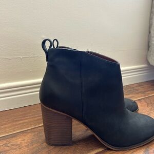 These BP ankle boots showcase a sleek black leather-like finish with a chunky heel for a comfortable lift. The minimalist design features a V-shaped opening and a round toe, making them a versatile addition to any wardrobe. Slip-on style ensures ease of wear, perfect for both casual and formal occasions.