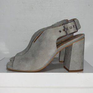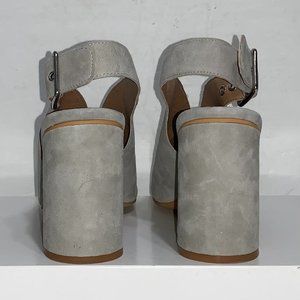 A buckle strap adds a bold finish to a block-heel sandal that exemplifies retro-cool style.