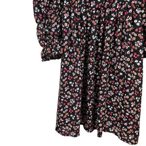 A cute and flowy floral print mini dress from BP. Three quarter length puff sleeves with elasticised cuff and ruffle detail. Smocked back and flowy skirt. Square neckline. Elastic under bust. Lined. Black with fine all over floral print.