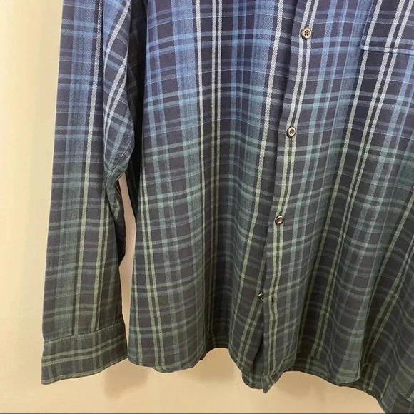 Striking, soft all over plaid button up shirt from BP. Dip dyed plaid for an ombre effect. 100% cotton. Spare buttons attached.