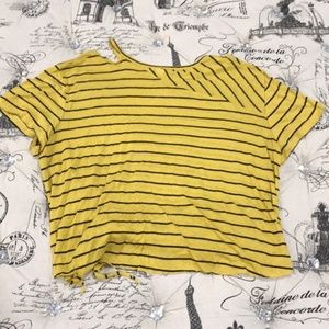 An angular seam and a slender slit alter the neckline of a softly draped tee finished with a trendy bow-tied hem.