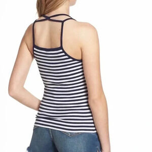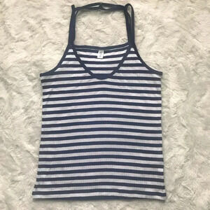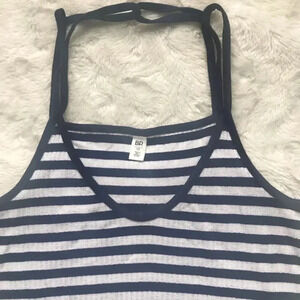 Navy and white ribbed tank with spaghetti straps. Straps cross in the back, fabric is stretchy. 23” length (size Medium). 96% rayon, 4% spandex.