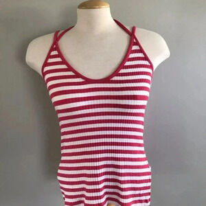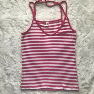 Pink and white ribbed tank with spaghetti straps. Straps cross in the back, fabric is stretchy. 23” length (size Medium). 96% rayon, 4% spandex.
